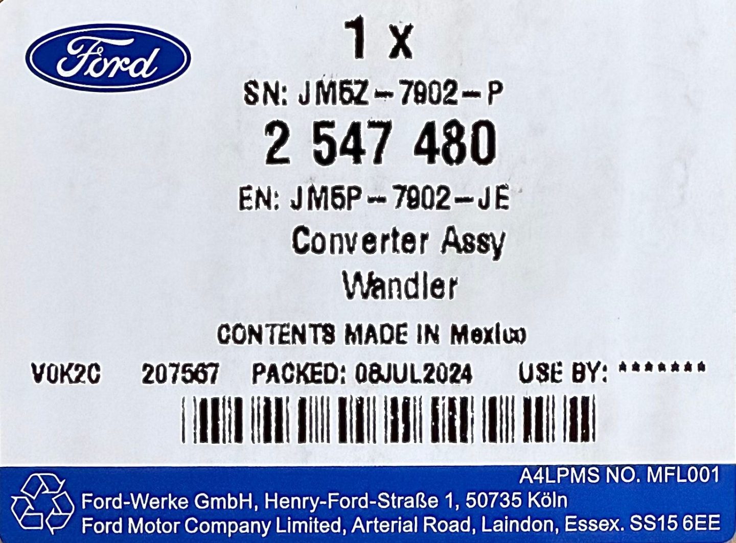 GENUINE FORD 8F35 / 8F40 8 SPEED AUTOMATIC TRANSMISSION TORQUE CONVERTER 2 547 480